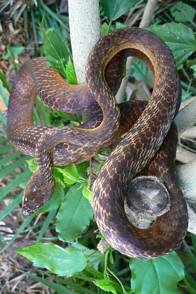 Brown tree snakes have a slender body with a distinctly bulbous head which is well defined from a narrow neck. They have very large eyes with vertical pupils. Their colour generally stays consistent the the upper section of the body being brown to a reddish-brown or even dark orange, with irregular, indistinct darker cross-bands all over the body of the snake. Belly can be creamy colour but is often apricot or orange. Central row of mid-body scales running down the centre of the back larger than surrounding mid body scales. When they fee threatened they will hold their upper half of their body off the ground in a strong defensive "S" shaped posture. Midbody scales at 19 -23 rows. This species grows to be around 1.2 meters on average but specimens can reach up to 2 meters occasionally. They are a nocturnal species found at night unless of course they are disturbed from their hiding spot during the day. They like to hunt and eat small birds but also their eggs. They will also eat small mammals, frogs and other