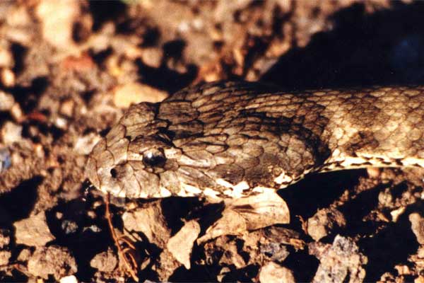 Short, thick body with distinct large triangular head. Narrow neck and abruptly short, thin tail, usually cream or black. Colour variable, generally shades of grey to reddish-brown with irregular cross-banding. Belly greyish-cream with dark flecks. Lips usually barred or striped. Scales may be roughish or weakly keeled. Midbody scales at 21 -23 rows.
