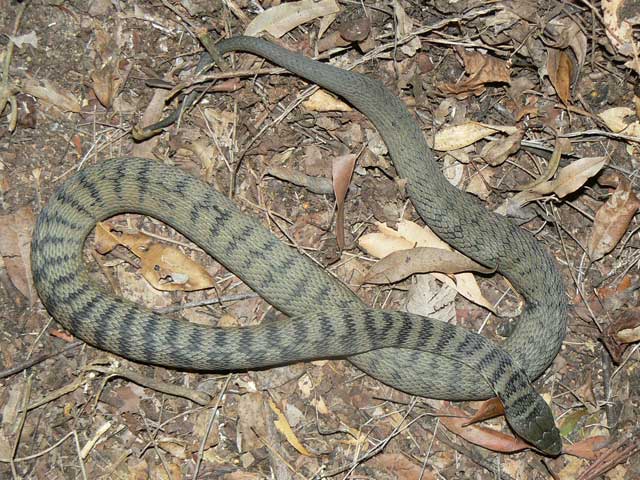 Brown to olive with narrow, irregular cross-bands or blotches of darker brown. Belly surfaces greenish-grey or olive-cream often with darker blotches. Midbody scales have a raised keel or carinated appearance. Coloration and scale structure has led to some confusion with the non venomous Keelback Snake (Tropidonophis mairii) which differs in having a loreal scale present and usually more defined keels on each scale. Midbody scales at 23 rows.