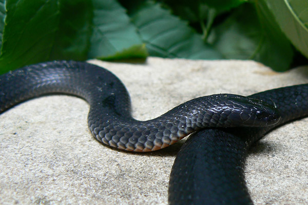 Small black eyes barely discernible from surrounding dark scales. Colour generally glossy dark grey to black with cream or pink belly, sometimes with dark spots. Belly colour does not extend up onto sides, and is not visible as it is on the Red-bellied Black Snake. Midbody scales at 15 rows.