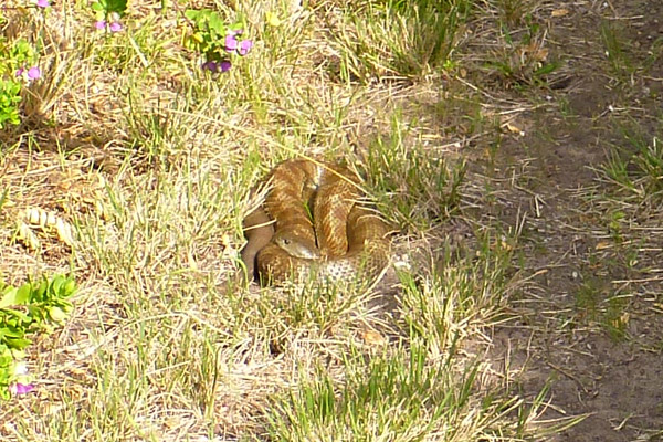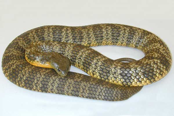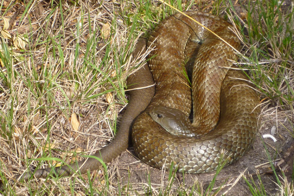 Solidly built snake with a large broad flat head. Colour variable with many shades from light grey to olive, brown through to black. Cross-bands of lighter scales continue down the length of the body. Belly lighter than main colour, usually cream or grey, often darker on throat & under tail. Midbody scales at 17-19 rows (rarely 15)
